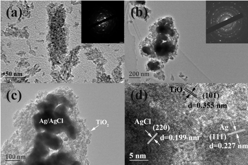 图1制备样品的TEM照片: (a)Ti3+-TiO2介晶; (b-d) Ag/AgCl@Ti3+-TiO2复合材料