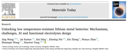 联合上海交通大学在国际知名期刊《Materials Today》(影响因子22)上发表了一篇题为“Unlocking Low Temperature-Resistant Lithium Metal Batteries: Mechanisms, Challenges, AI and Functional Electrolytes Design”的综述文章,为低温环境下锂金属电池(LMBs)的性能优化提供了全新的思路与解决方案,有望推动锂金属电池在极端条件下的广泛应用。抖音风