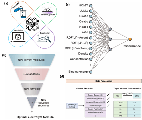 研究团队利用AI模型分析超万篇文献数据,预测溶剂-盐-添加剂组合的性能。展示了通过机器学习筛选的氟化有机分子,可构建无机-有机杂化SEI层,显著提升界面稳定性。