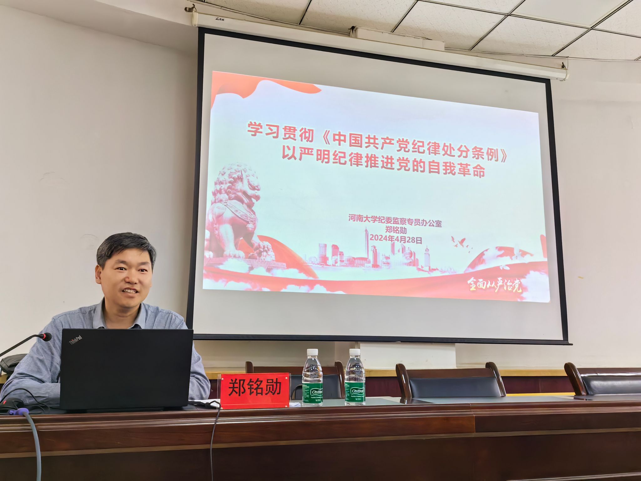 郑铭勋以《学习贯彻<中国共产党纪律处分条例>,以严明纪律推进党的自我革命》为题,带领大家深刻认识了《条例》修订的背景历程和重要意义,并结合实际案例,逐条逐字领学了《条例》的内容。郑铭勋提醒全体党员同志们,一是要深入学习《条例》内容,做到知己明己;二是要加强党纪教育,自觉遵规守纪;三是要严格精准执纪,严管厚爱相结合。