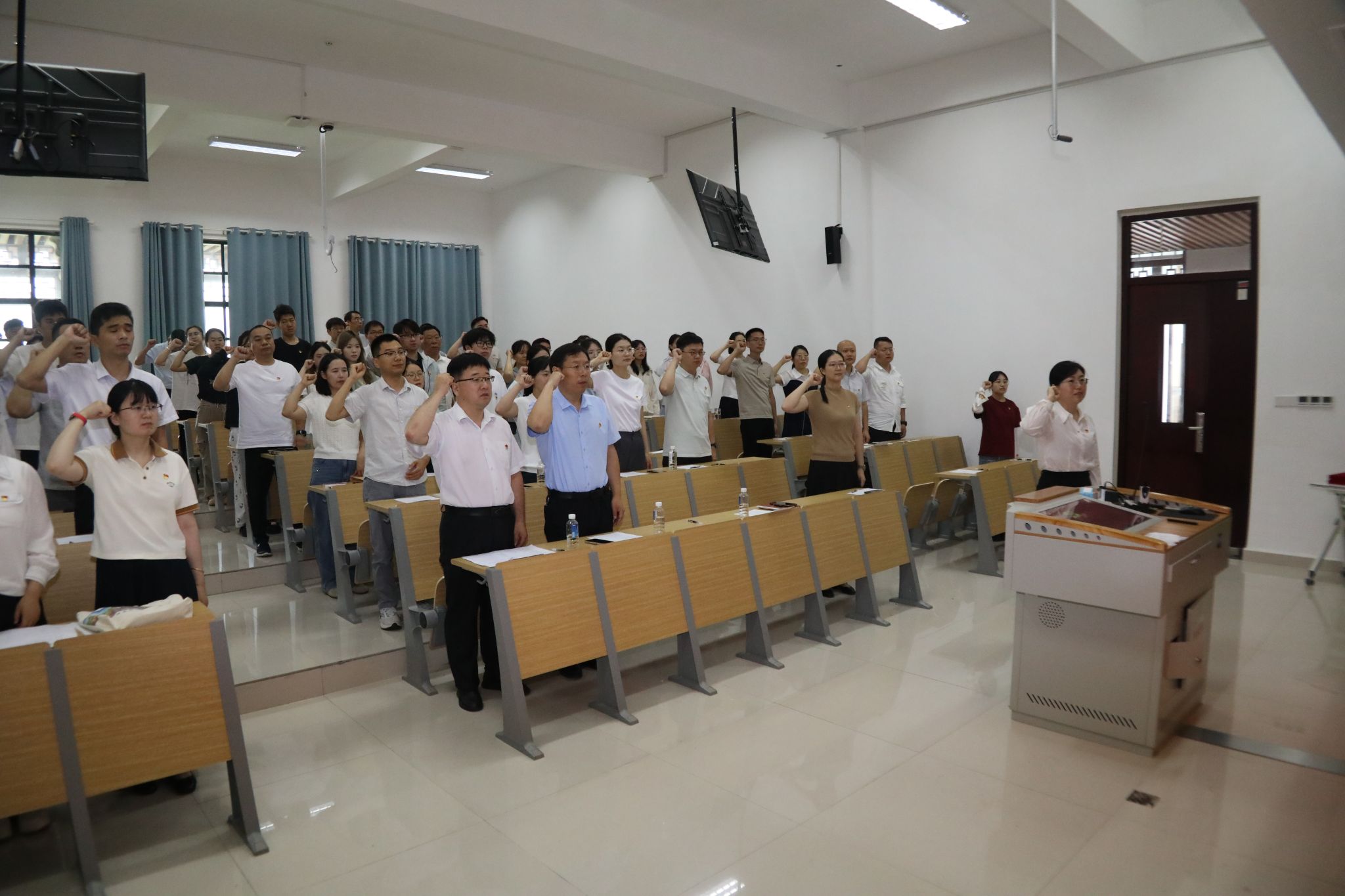 为庆祝中国共产党成立104周年,在“七一”这个特殊的日子里,程亚敏带领学院全体党员重温入党誓词,用铿锵有力的誓言彰显共产党人不忘初心、牢记使命的坚定信念。副院长杨浩宣读了《中共抖音风
