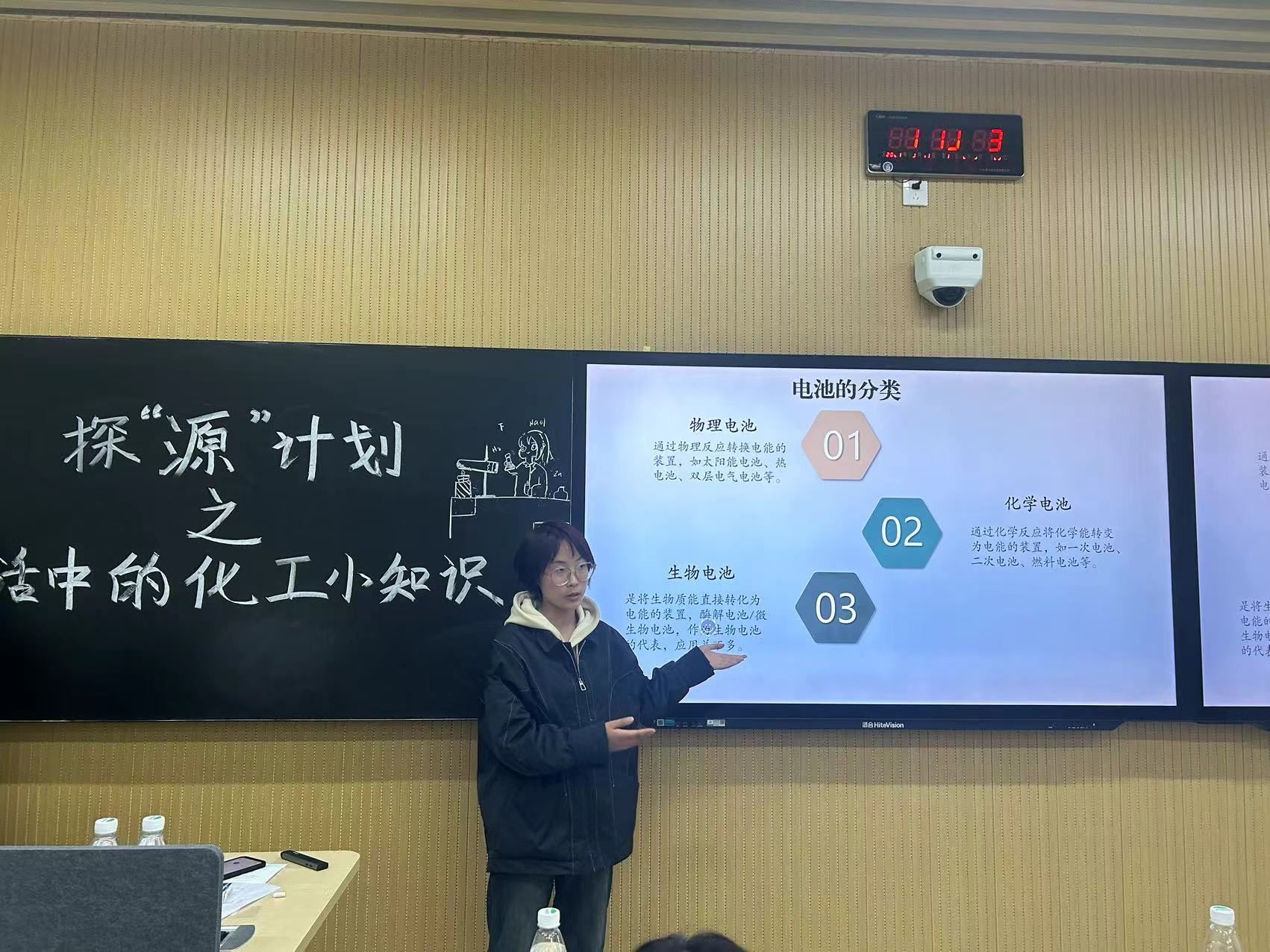 学生围绕“能源”和“化工”领域的研究方向,充分发挥个体主观能动性,自发形成学习小组,从生活中常见的物品出发,探究学习不同化工材料的性能以及在生产生活中的应用。活动现场,各小组就自己的学习内容分别作了汇报。第一小组聚焦电池,介绍了不同种类电池的特点,又重点分享了固态电池在电动汽车、移动设备以及航空航天领域的广泛应用。让人深刻感受到电池在现代化生活中的不可或缺性。第二小组从生活中的塑料入手,分析了不同塑料的性能和应用,重点介绍了塑料的处置和回收利用,并提出生物酶降解塑料发展所面临的难题,鼓励全体学生努力学习,为工业技术的发展作出自己的贡献。