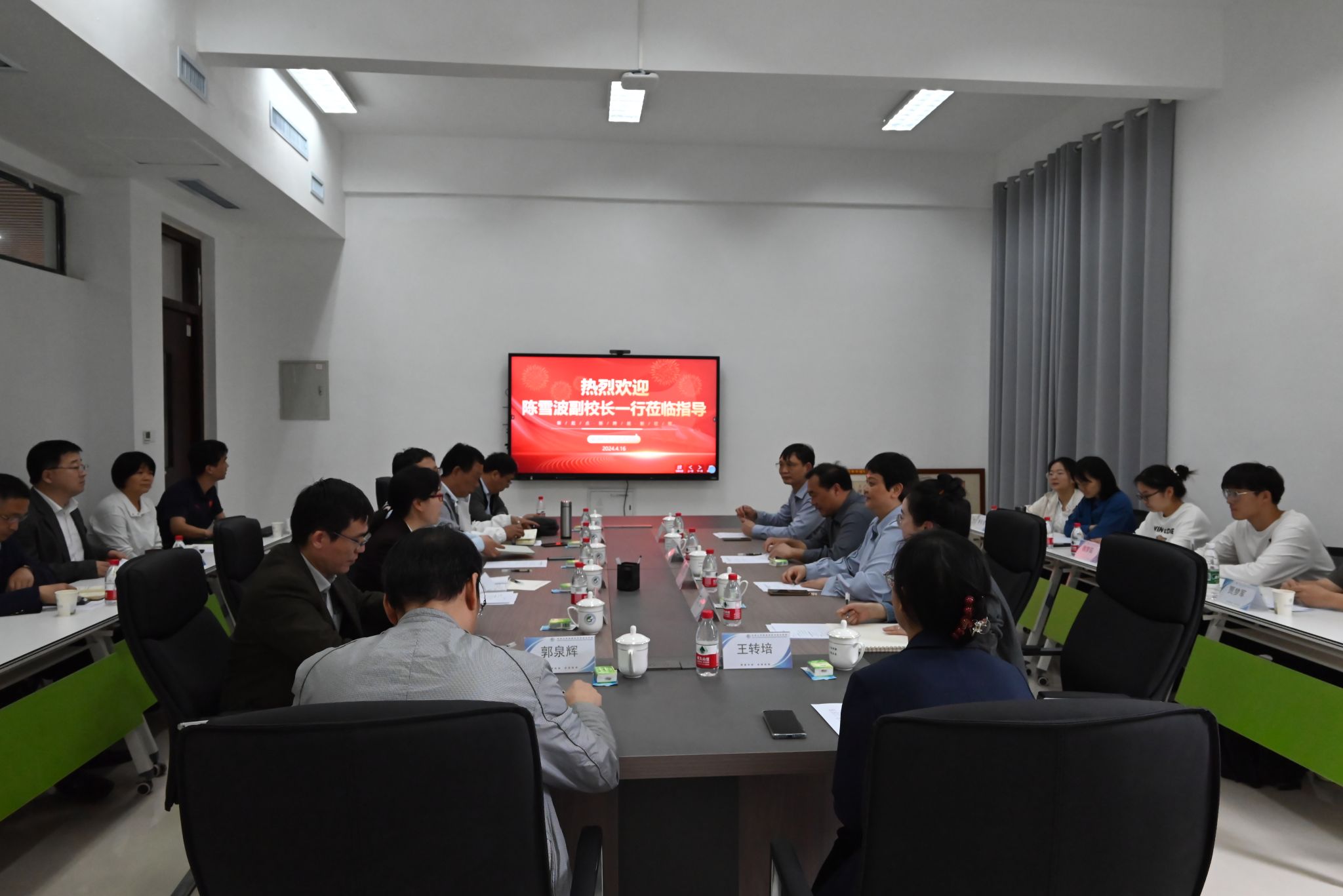座谈会前,陈雪波参观了学院的办公和实验场地,详细了解楼层规划和学院建设进度。
