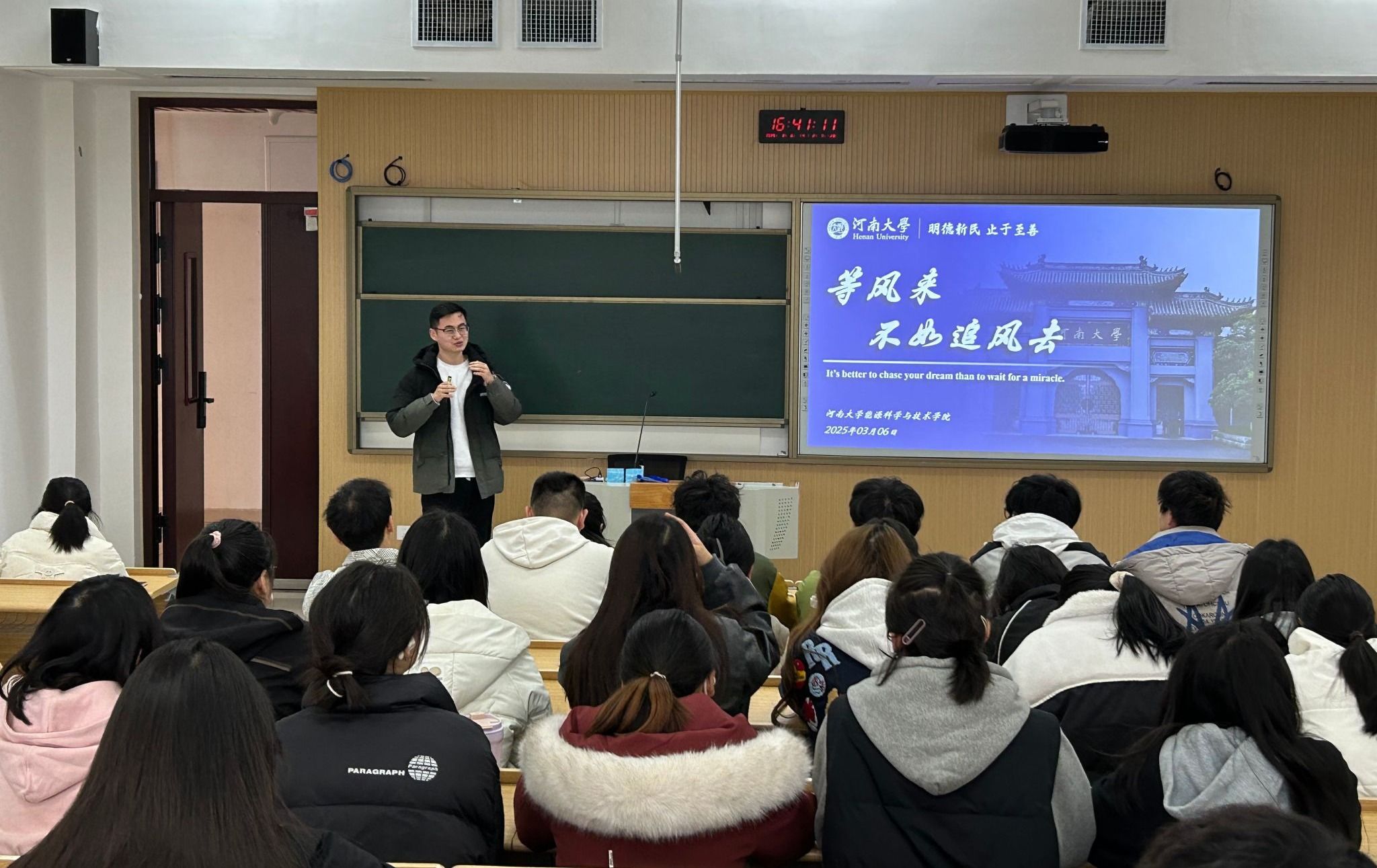 最后,高年级同学吕明光与大家分享学习经验。他围绕“等风来,不如追风去”的主题,结合自身经历,鼓励同学们主动把握机遇,从科研竞赛、实践学分获取到日常时间管理,层层剖析行动力与规划的重要性。“不要等待机会敲门,而要用脚步丈量可能”,吕明光以参与国家级科创项目的经历为例,强调主动尝试的意义。