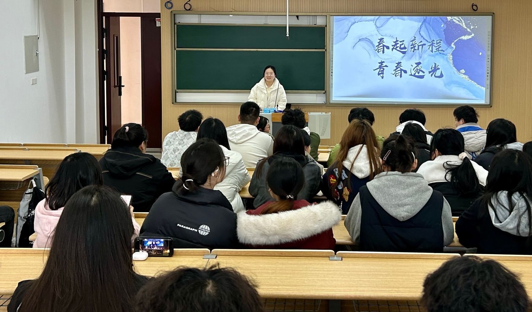2023级本科生于3月6日在九章北楼B301教室举办以“春启新程,青春逐光”为主题的班会活动。学院党委书记助理芦海燕、2023级辅导员曹莹莹、化学工程与工艺2班班主任孙彩云参加活动。